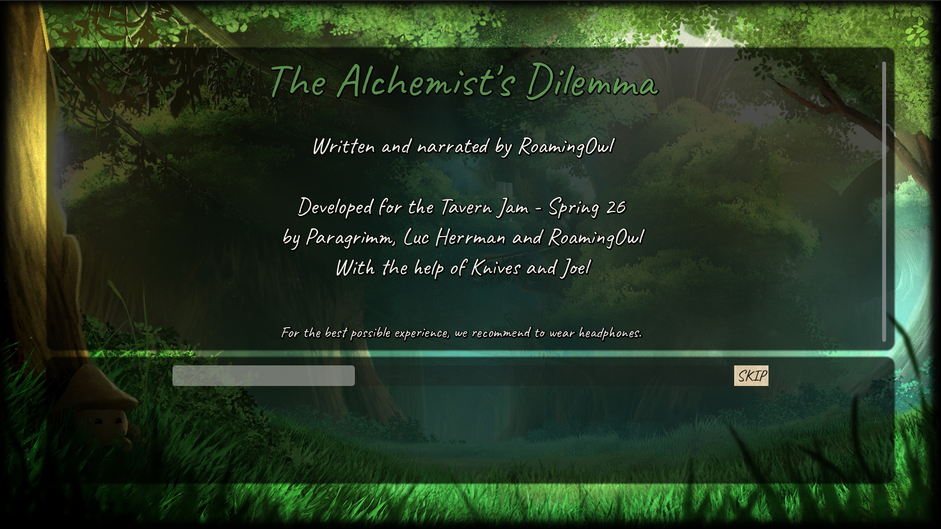 The Alchemist's Dilemma is an interactive audiobook by Paragrimm, Luc Herrmann and RoamingOwl. It was developed within 7 days in Godot in combination with ANgin for The Artists Tavern Game Jam - Spring 26.